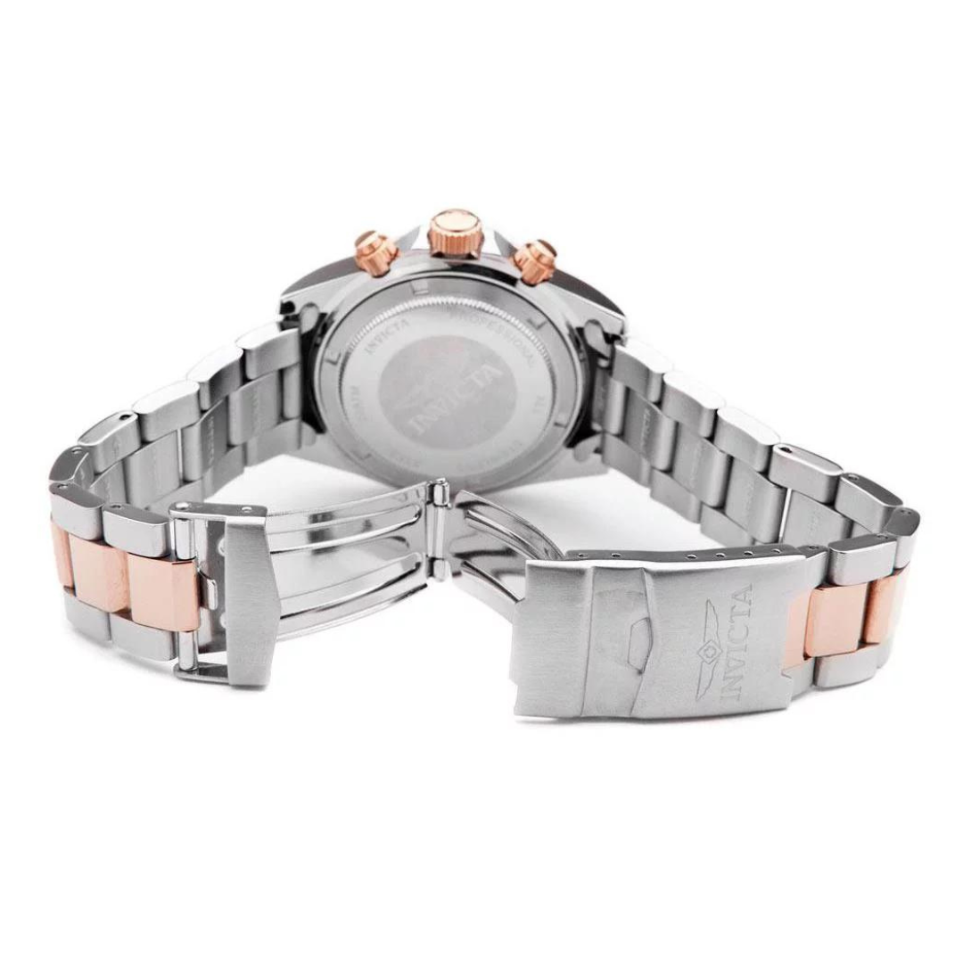 Carcasa de acero inoxidable con un dos tonos (plata y Rose Oro Pulsera De Acero Inoxidable). Fijo Rose Oro Bisel con Taquímetro. Dial de plata con rosa gold-tone índice de manos y marcadores de hora. Marcadores de minuto alrededor del borde exterior. Tipo de esfera: analógica. Manecillas luminiscentes. Indicación de la fecha entre las 4 y las 5 posiciones de o 'clock. Cronógrafo – Tres subdiales: 60 segundos, 60 minutos y 24 horas. Movimiento de cuarzo. vidrio mineral resistente a los arañazos. Corona roscada. Caja sólida. Diámetro de la Carcasa: 39,5 mm). Espesor de la caja: 13 mm. Round forma de diseño. Ancho de banda: 20 mm. Longitud de la banda: 8.25 inches. Fold sobre cierre con cierre de seguridad. Resistente al agua a 200 metros/660 pies. Funciones: Cronógrafo, taquímetro, fecha, hora, minuto, segundo. Reloj deportivo estilo.
